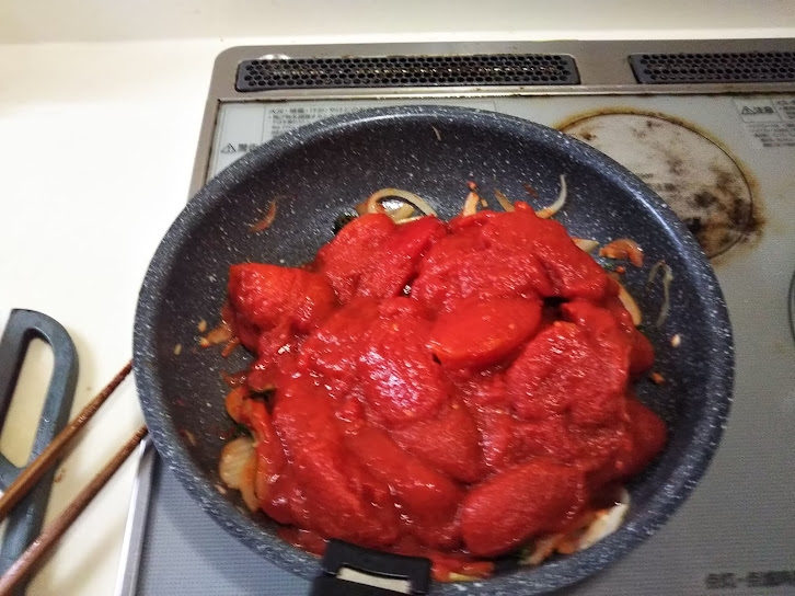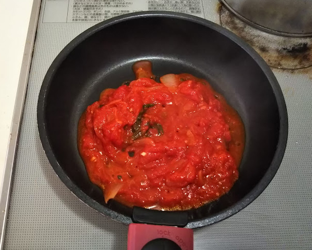 6. 水を切ったトマトを加え、木ベラで潰しながら炒め、沸騰したら弱火にして約30分程煮込む