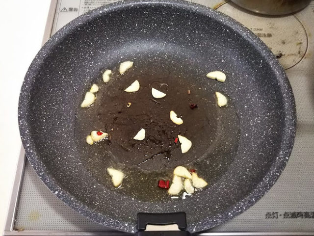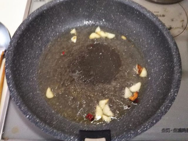 3. フライパンにオリーブオイル、ニンニク、鷹の爪を入れて火にかける
