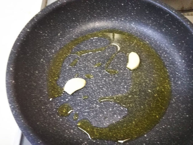 2. フライパンに2つに切ったニンニクと油を入れて火にかける