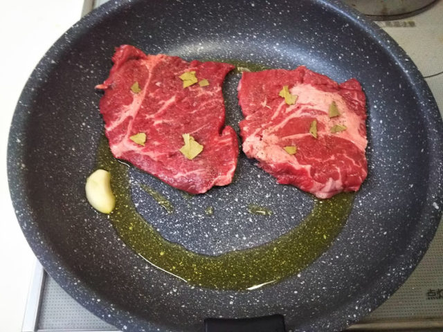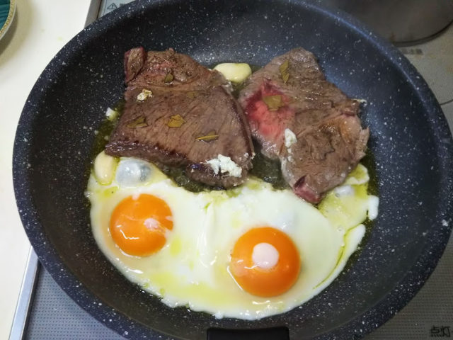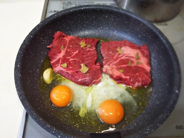 4. ステーキを焼いてるフライパンで目玉焼きも焼く