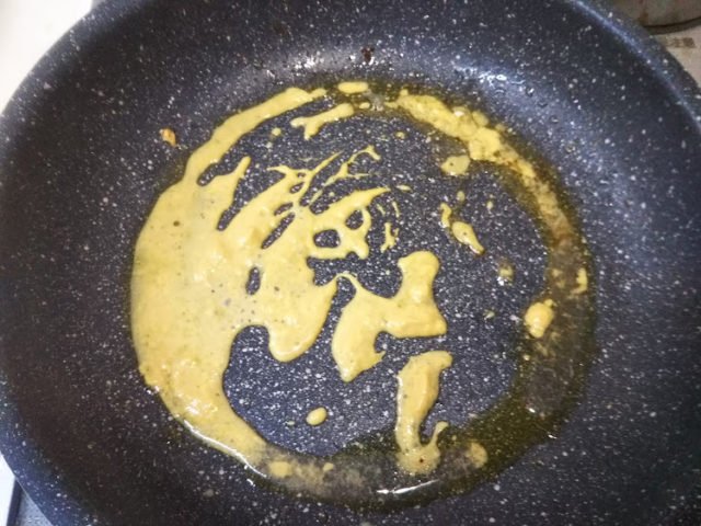 6. フライパンの油を拭い、ディジョンマスタードと白ワインビネガーを入れて火にかける