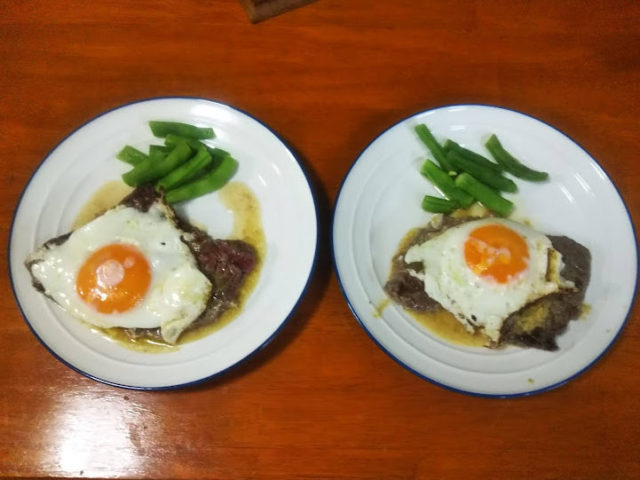 ポルトガル風のステーキです。ステーキの上に目玉焼きを載せるのがポルトガル風なんですって。