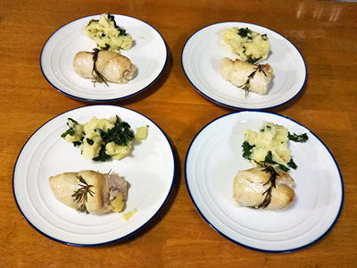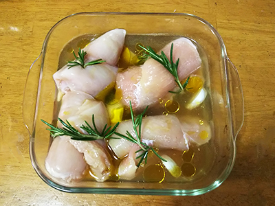 アイルランド料理の本を読んでいたらBlissful Rosemary Chicken という料理を発見しました。他の本には載っていないようなので、これが典型的なアイルランド料理かどうかは今一つ謎なのですが…ハーブ好きには何とも魅力的な料理なのでコルカノンや大麦のスープと一緒に作ってみました。