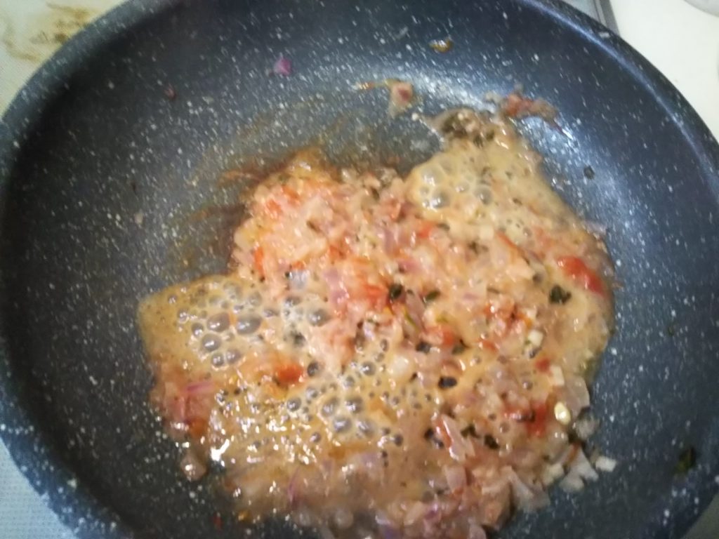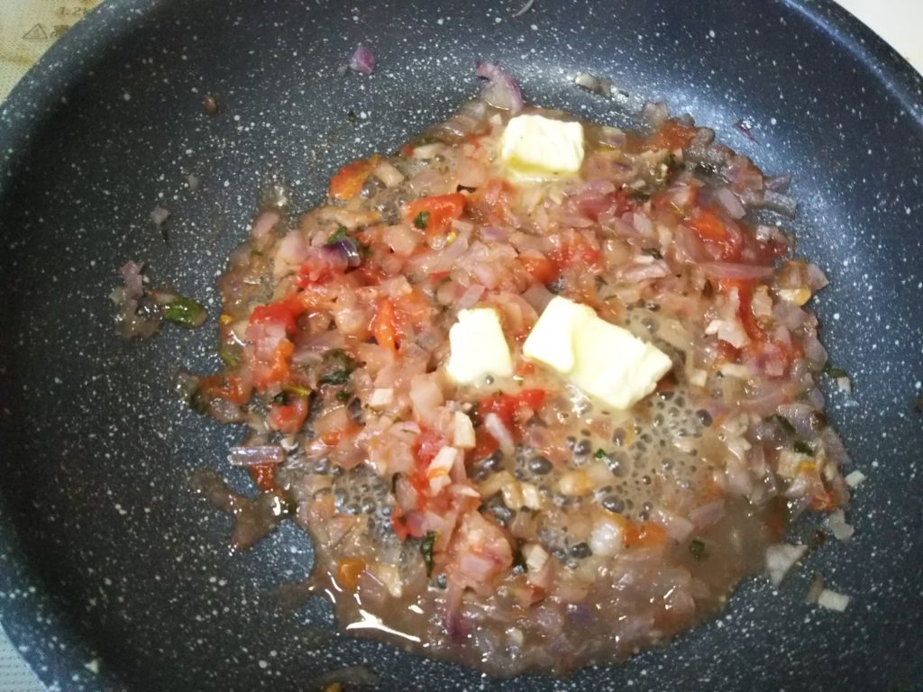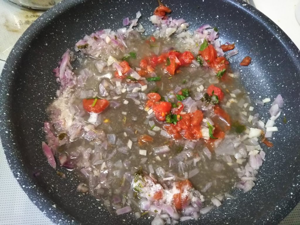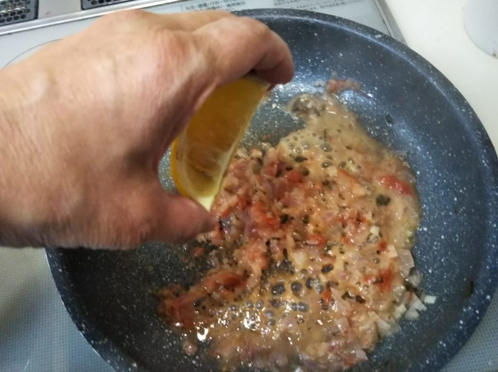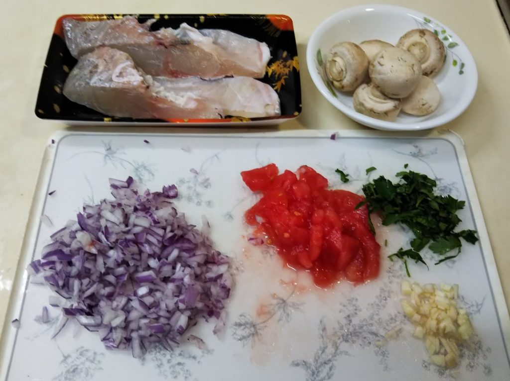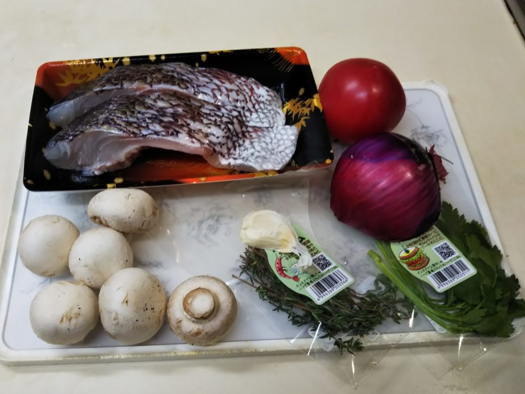 1. 鯛は塩・胡椒をふっておく。マッシュルームは石づきを落とす。トマトは皮を剝いて種を取り除き、ざく切りにする。紫玉葱、ニンニク、イタリアンパセリは微塵切りにする
