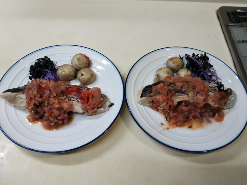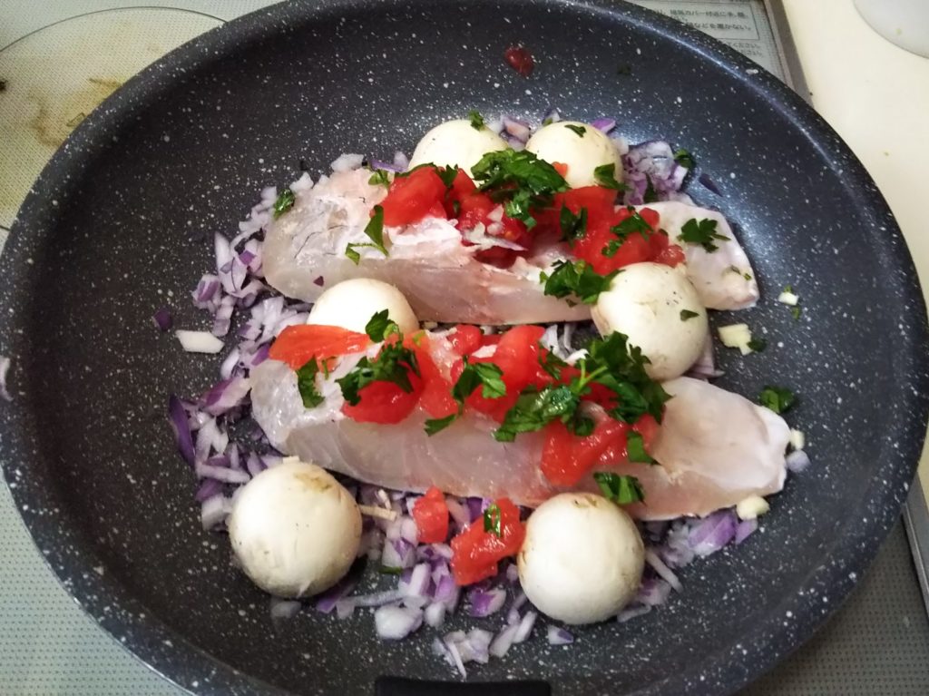 3. 2.の上に鯛とマッシュルームを置き、トマトとイタリアンパセリを載せる