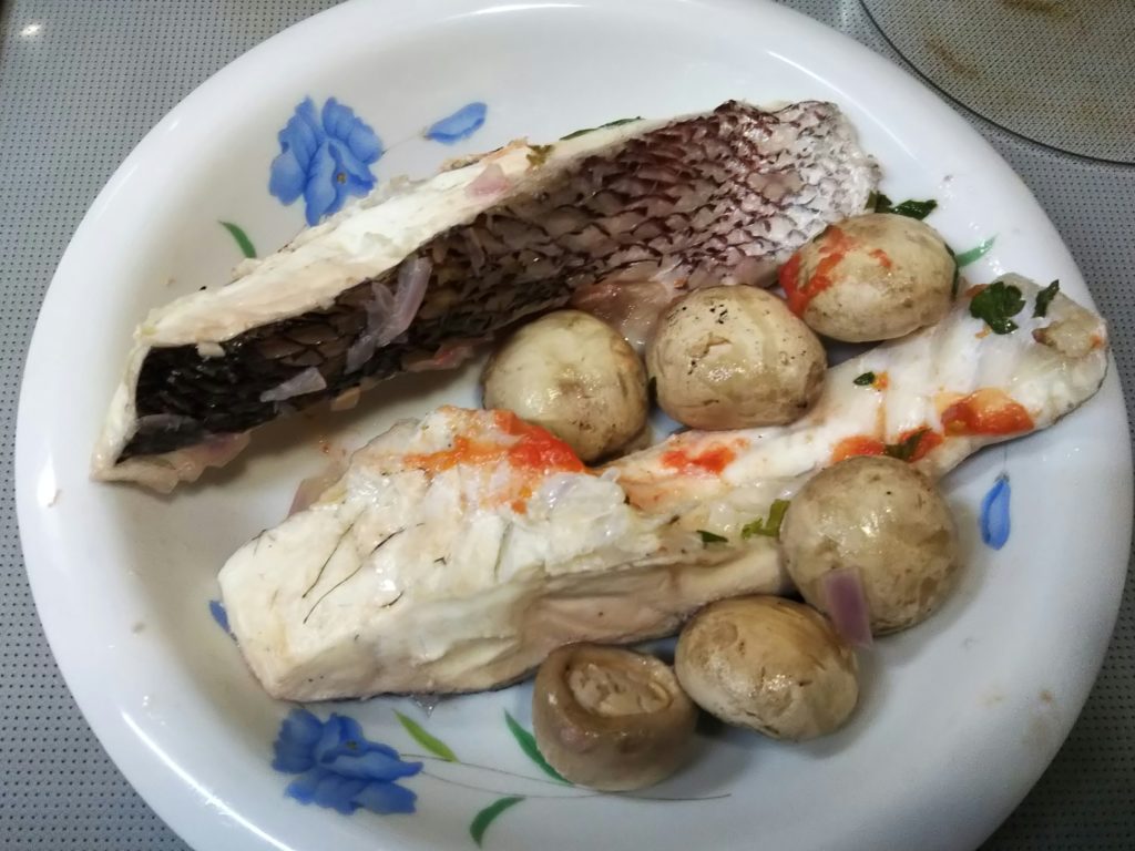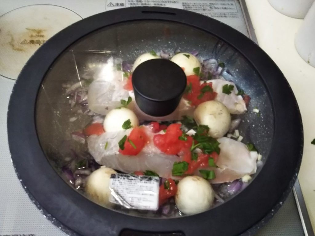 5. 火が通ったら鯛とマッシュルームを取り出す