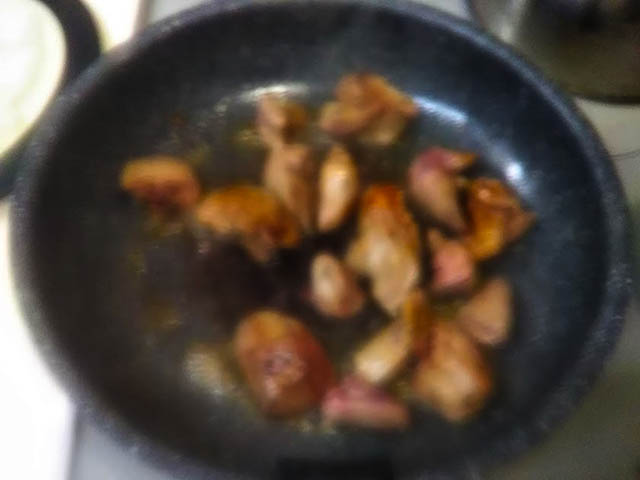 4. 蓮根を一旦除け、フライパンにバターを溶かし洗って水けを拭き取ったレバーを焦げ目がつくまで炒める