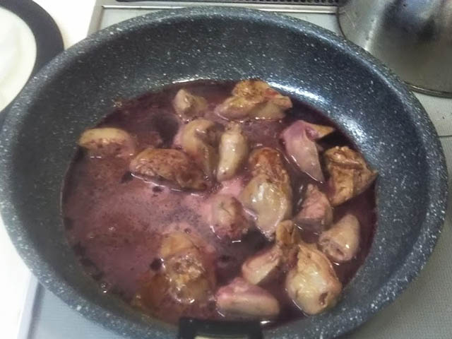 鶏のレバーを赤ワインで煮込んだ一品です。レバーの臭みもそれほど感じられず美味しくいただけます。
