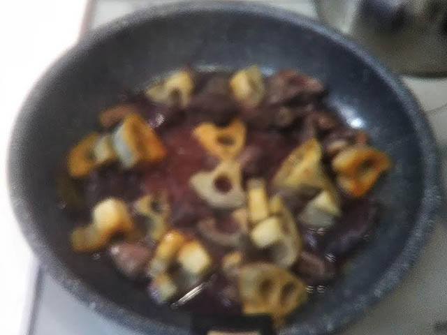 6. 蓮根とバルサミコ酢を加えソースを絡めながら2~分弱火で煮る