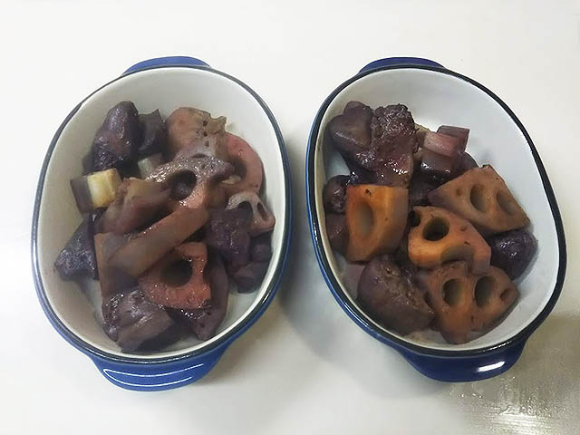7. 蓮根に味がなじんだら、具材だけ器に盛りつける