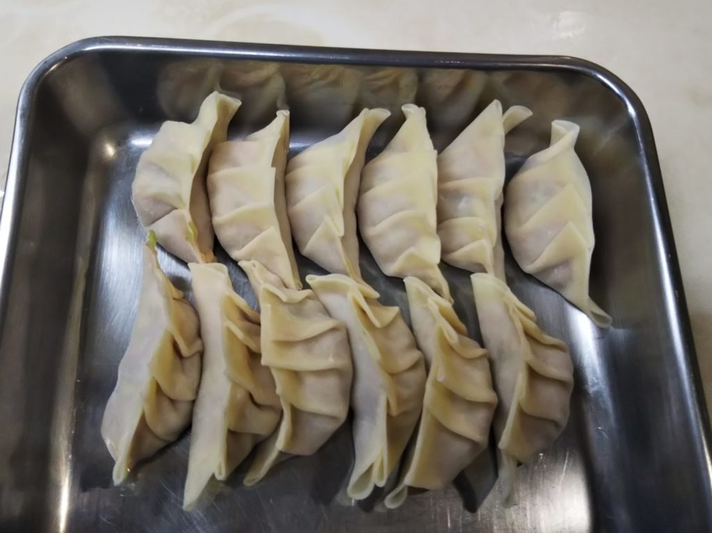 7. 余った餃子はトレイにのせて冷凍する。もやしは別途茹でておく