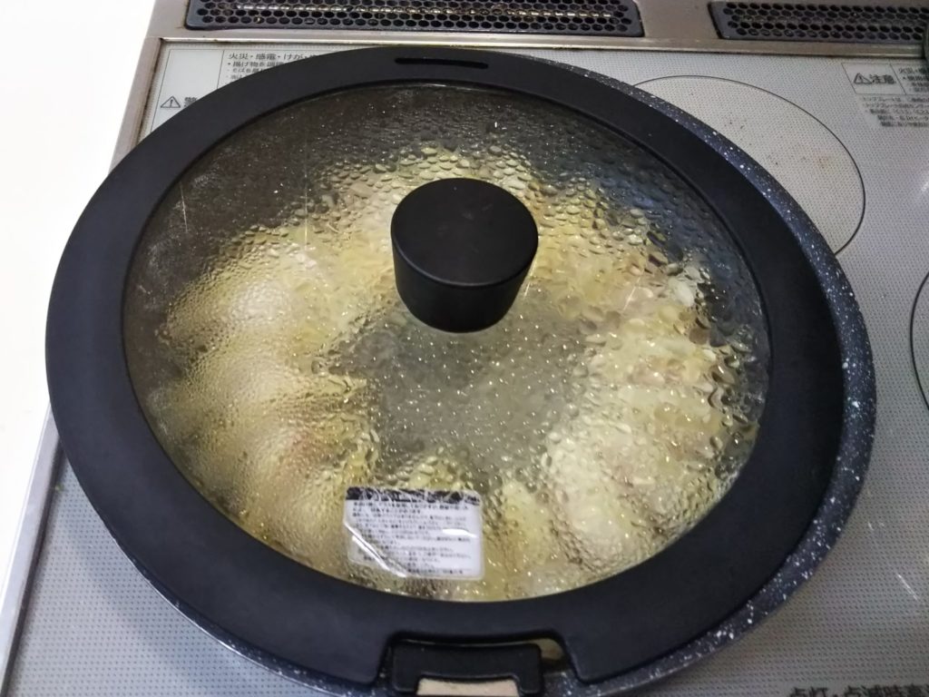 8. 餃子の底が焼けてきたら湯を加え、蓋をして蒸し焼きにする