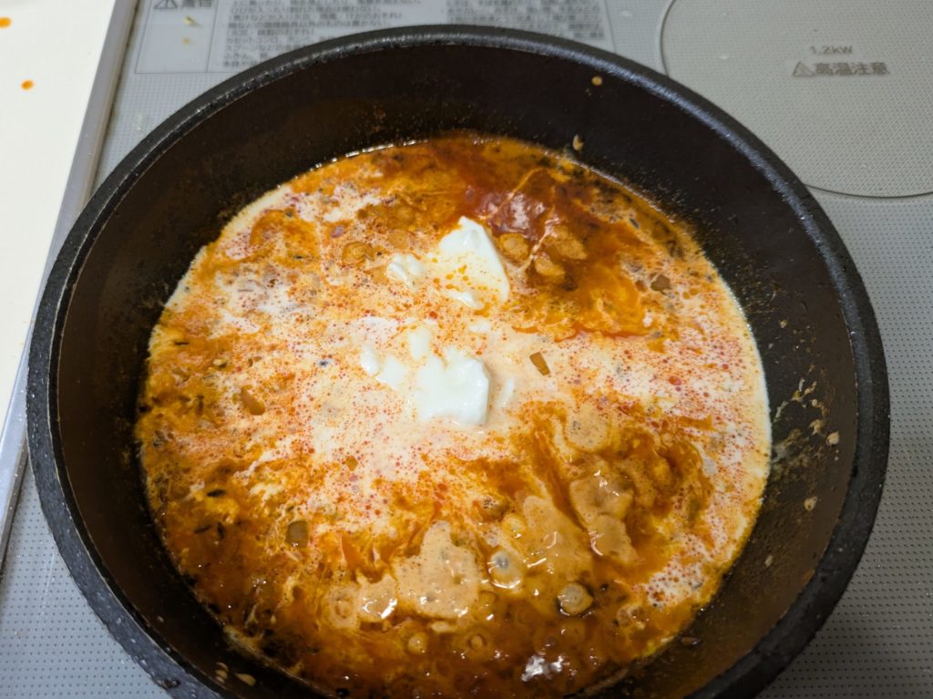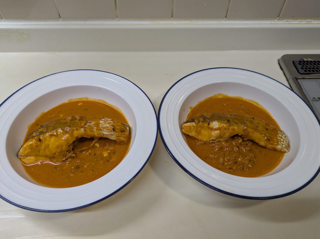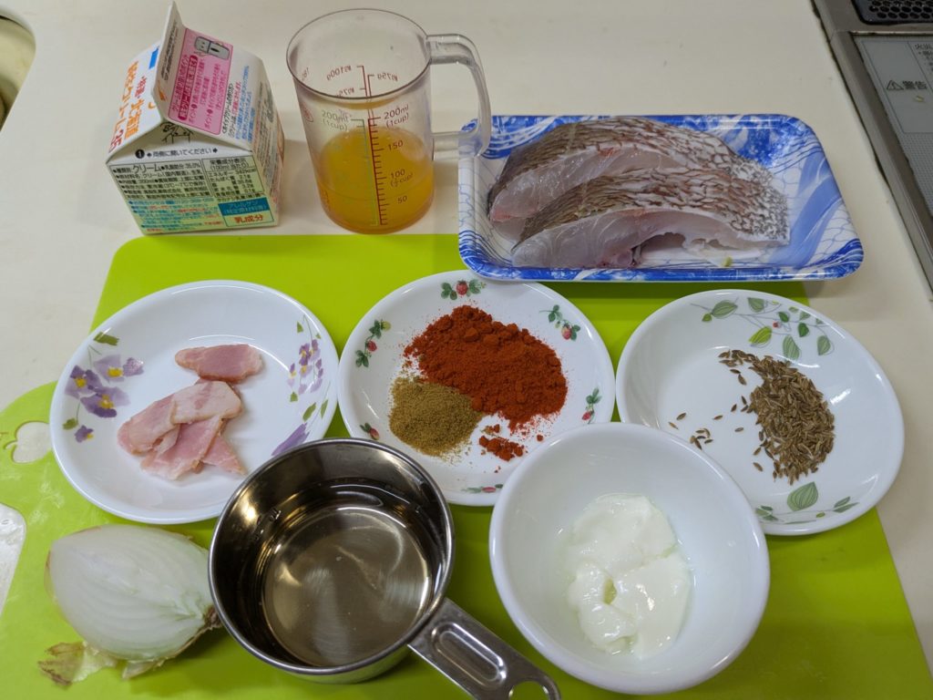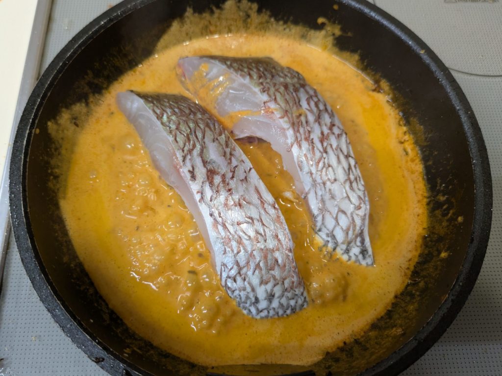 私、またしても手順を間違えてしまいました。ヨーグルトと生クリームを加えるのは魚を取り出した後でした。その上オレンジジュースと一緒に見ずもいれなければならなかったのですが、入れてません。なんかね、Aを入れるとかBを加えるとか書いてあるの結構間違いちゃうんですよ。私だけ?なので私のレシピはその都度食材を表示することにしています。正しいレシピで作りたい方はリンク先をご覧ください。このやり方でも結構それなりにできました。でも生クリームは後で加えた方がいいかな?とは思います。