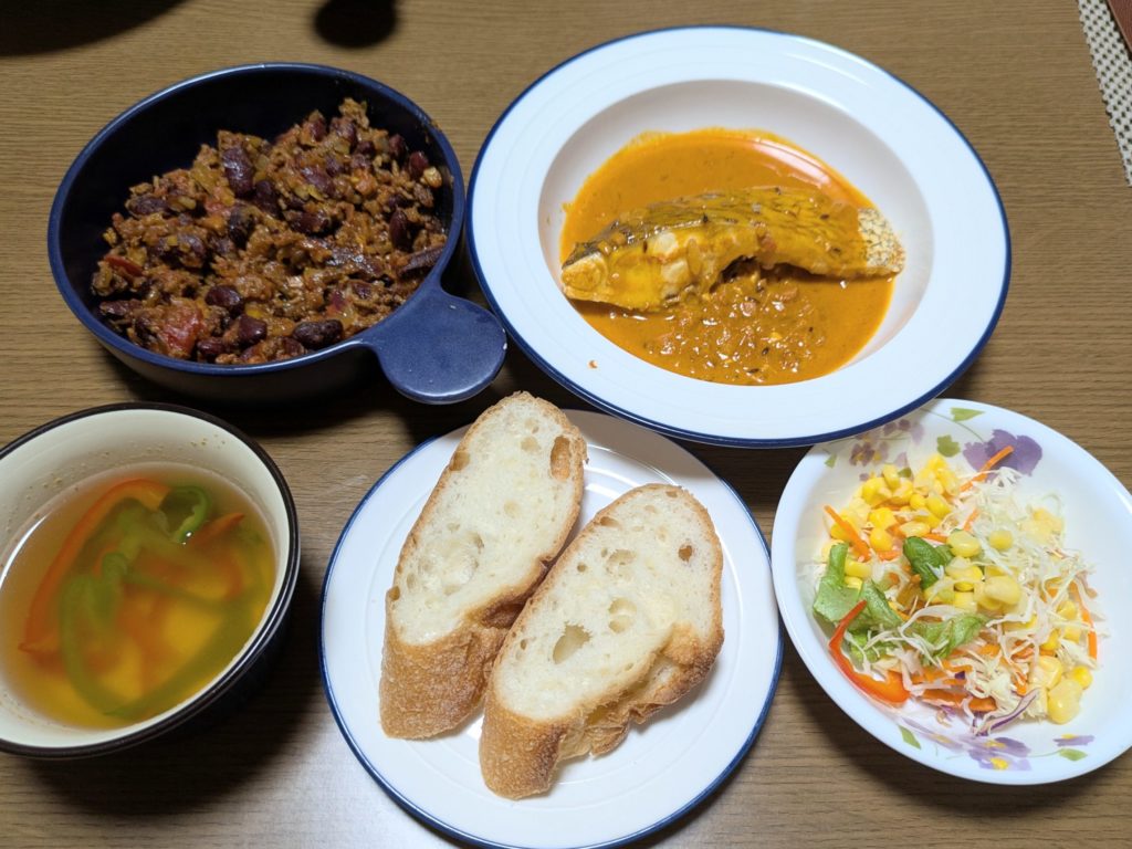 ←真鯛のオングロワ、チリコンカン、サラダ、スープ、パンを合わせた献立例