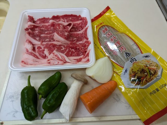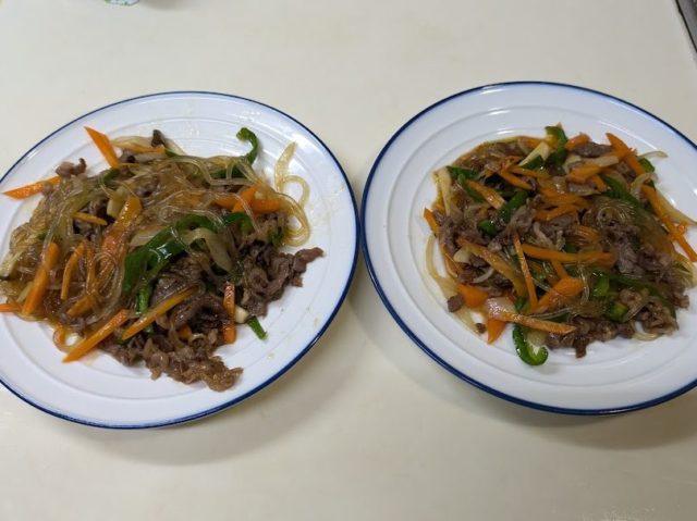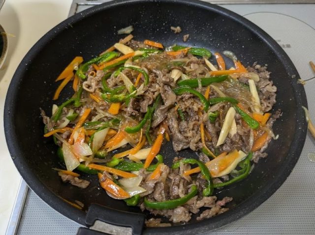 韓国料理のチャプチェに挑戦してみました。チャプチェとプルコギって似ていますよね?何が違うのか調べてみたところ、プルコギは牛肉がメイン、チャプチェは春雨がメインなんだそうです。だから春雨が入ってなければチャプチェとは言えないのですね。前に一度日本の緑豆春雨で作ってみたことがあります。今回は韓国春雨を使いましたが、日本の春雨と全然食感が違ってもちもちしています。これはなかなか美味しいです。