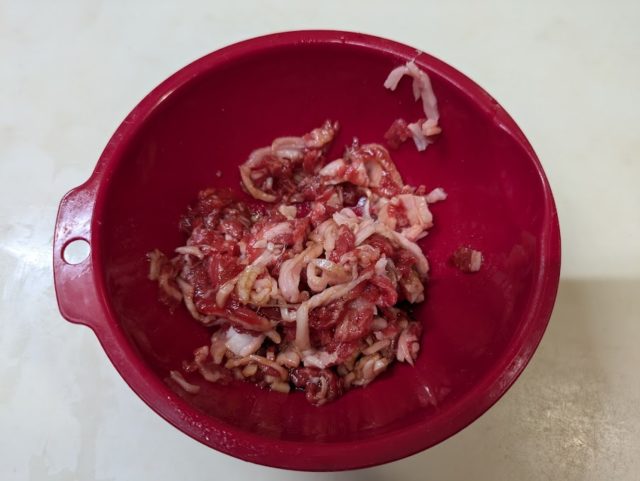 3. ボウルにB.の材料を入れて混ぜ、細かく切った牛肉を漬け込む