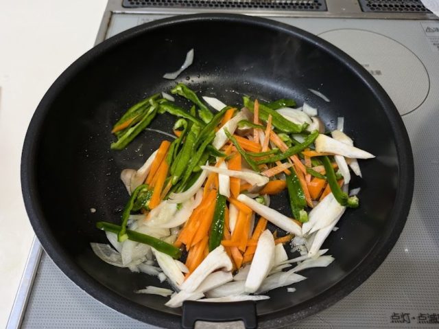 6. 野菜を炒めたフライパンでで肉を漬け汁ごと炒める
