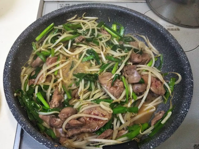 ご存知ニラレバ炒めです。ニラレバ炒めの中国語は韮菜炒牛肝、または韮菜炒猪肝と言うのが一般的で、特に検索すると牛のほうが出てきます。ということは、ニラレバ炒めは基本牛のレバー、もしくは豚のレバーを使うのが定番のようです。ところが我が家は牛や豚を使うこともありますが…鶏のレバーを使うことが多いのです。牛や豚に比べると鶏のレバーはクセが少なく、何よりあの砂肝のコリコリ感がまたいいのです。よかったらお試しください。ところで、名前を検索していたら貝印さんのサイトに韮菜炒肝片(ジャウツァイツォガンペン)という料理名が載っていたのでそれをタイトルにしました。この名前なら肉の種類は関係なさそうなので。