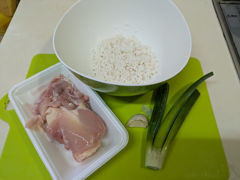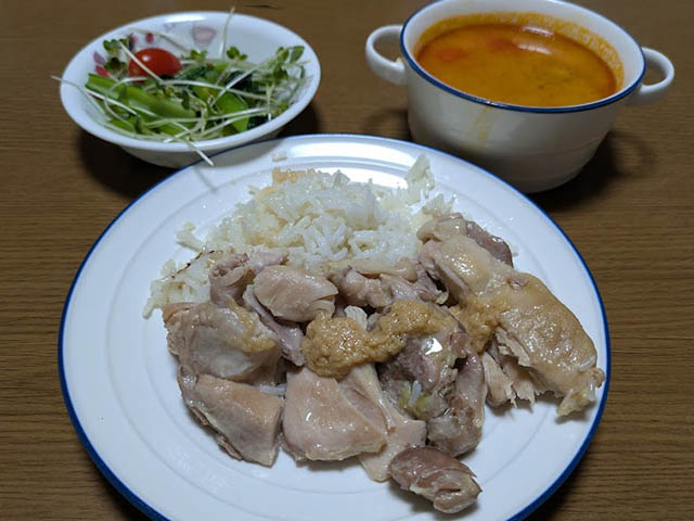 タイの代表的なごはん料理です。もともと中国海南島の文昌鶏(ウェンチャンジー)という料理が各地に派生してできたものらしいです。カオはタイ語でごはん、マンは油、ガイは鶏肉を意味します。以前炊飯器で作ったことがあったのですが、炊飯器で味の付いたご飯を炊くと匂いが残るのが嫌で、今回は圧力鍋で作ってみました。圧力鍋だと鶏肉が柔らかくなりすぎてしまうことと、ごはんが焦げやすいことが難点です。今後改良が必要でしょう。