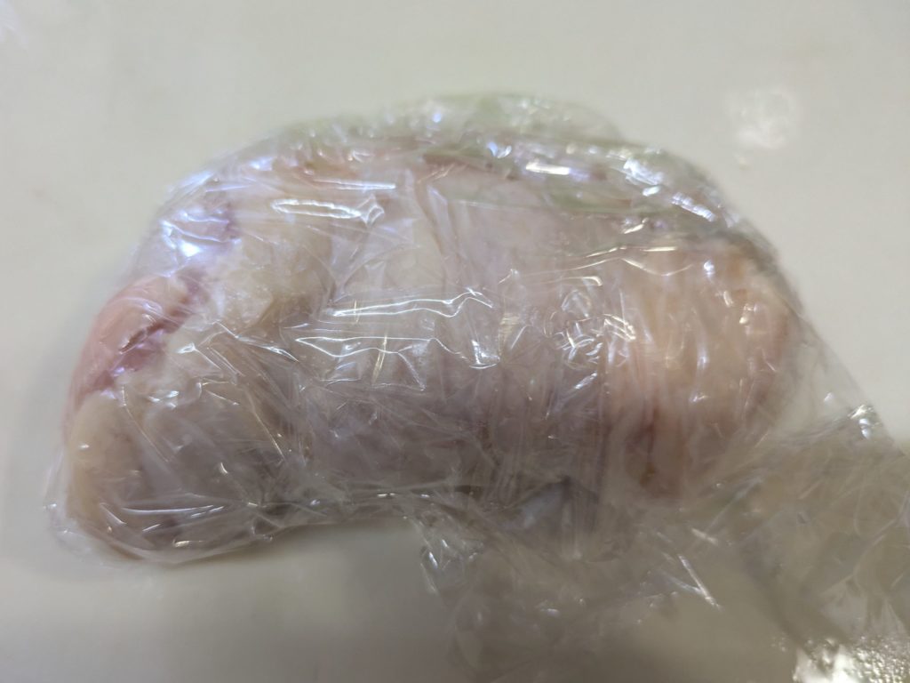 2. 鶏肉におろしニンニク、砂糖、塩の順に調味料をもみこんでラップに包んで冷蔵庫で休ませる