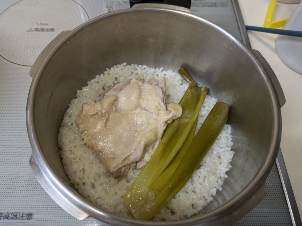 5. 火が止まり、完全に圧がとれたら蓋を開けて中の葱と鶏肉を取り出す