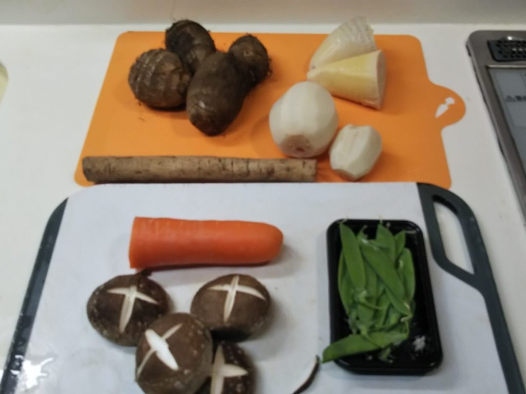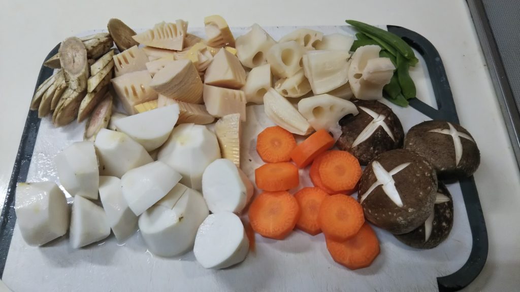 1. 野菜はそれぞれ皮を剝いて適当な大きさに切る。里芋、レンコン、筍は3㎝程度、人参は輪切り、ゴボウは斜め切り、シイタケは飾り包丁を入れる