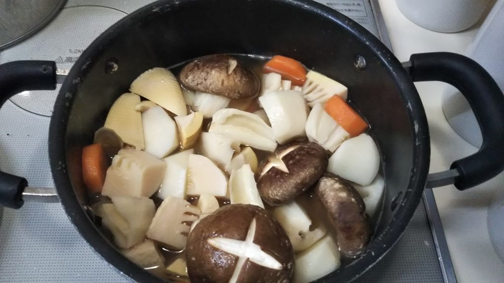 正月用の煮しめです。煮しめは煮物なのですが、だし汁が無くなるまで煮込んだ煮締めたものを言うそうです。我が家は毎年鶏肉を入れて作っていましたが、正月に食べる煮しめには本来肉や魚を入れずに野菜だけで作るのだそうです。なので今年は野菜だけで作ってみました。