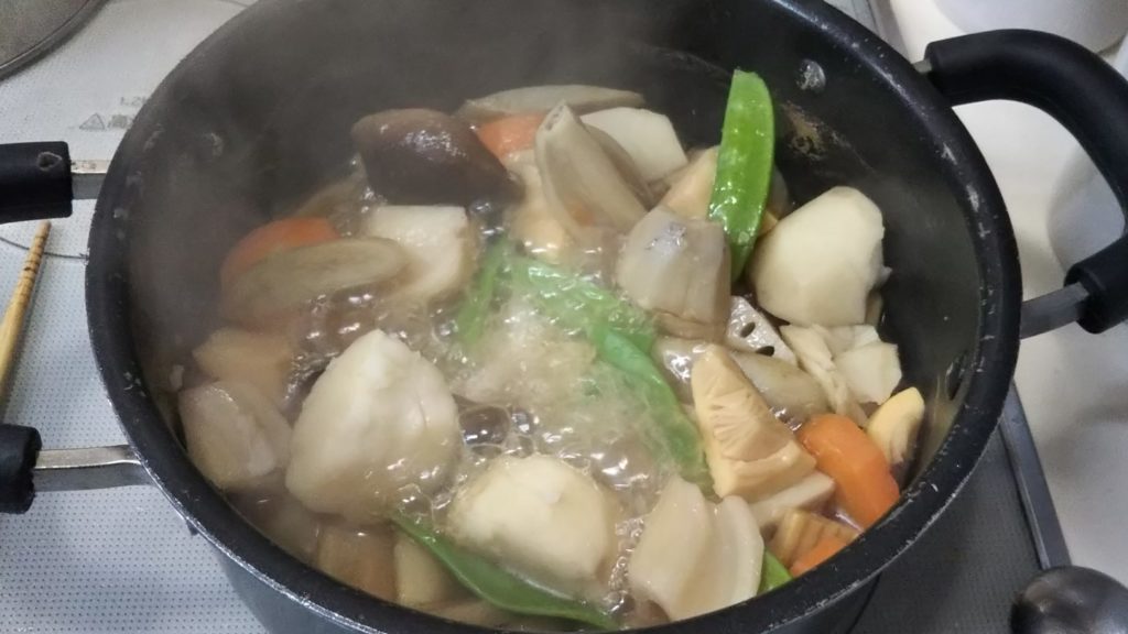 4. 里芋がある程度柔らかくなったら、筍、レンコン、シイタケを入れて再び弱火で煮込む