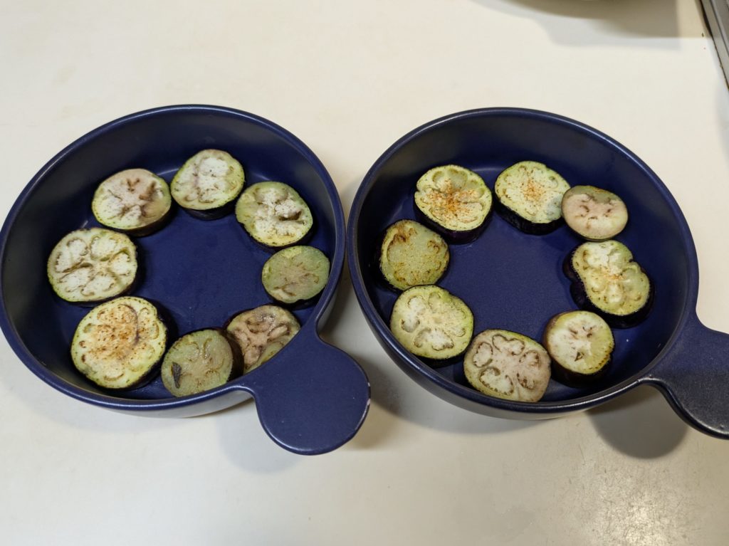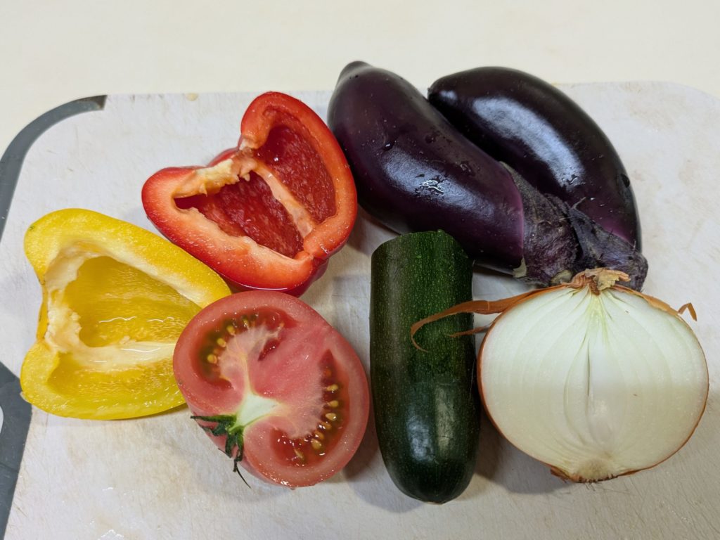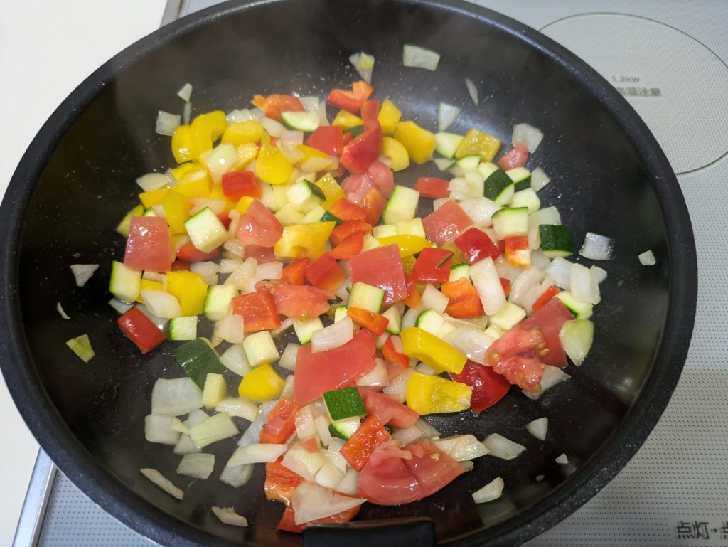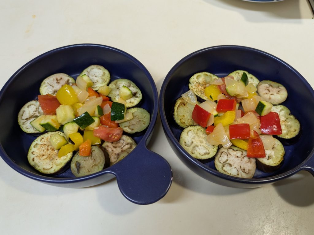 ラタトゥイユの材料は作りやすかったので下の分量で作って、残りは後日付け合わせに再利用しましたが、余らせるのが嫌ならば最初から半分の分量で作ってください。