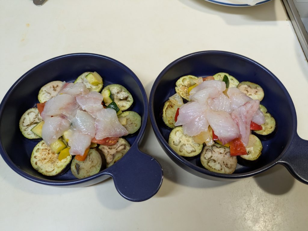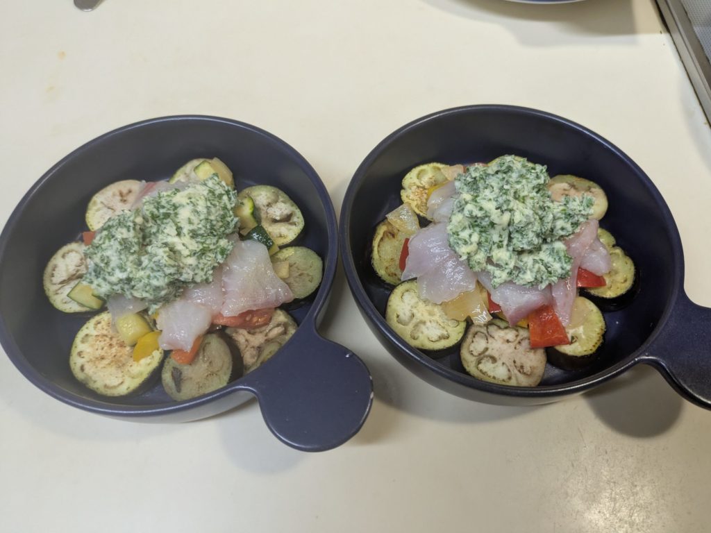 お手本のサイトではラタトゥイユや白身魚をセルクルでまとめていましたが、ないので適当に丸く盛り付けました。
