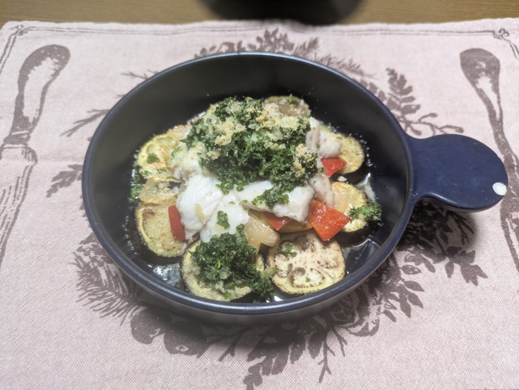 参考にさせていただいているサイト、家庭で作るオシャレなフランス料理に掲載されていたスズキとラタトゥイユのオーブン焼きというメニューを作ってみたくなり、早速材料を買いに行きましたがあいにくスズキが売っていなかったのでタラで代用してアレンジを加えて作ってみました。