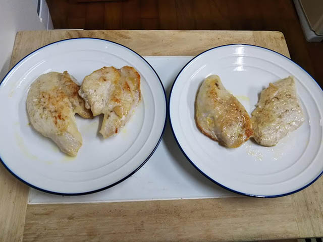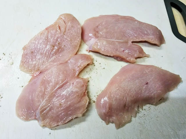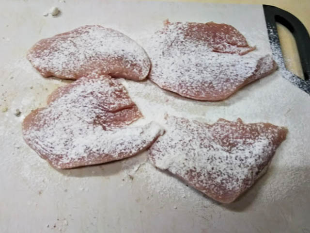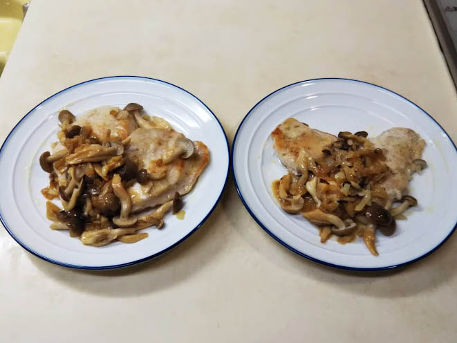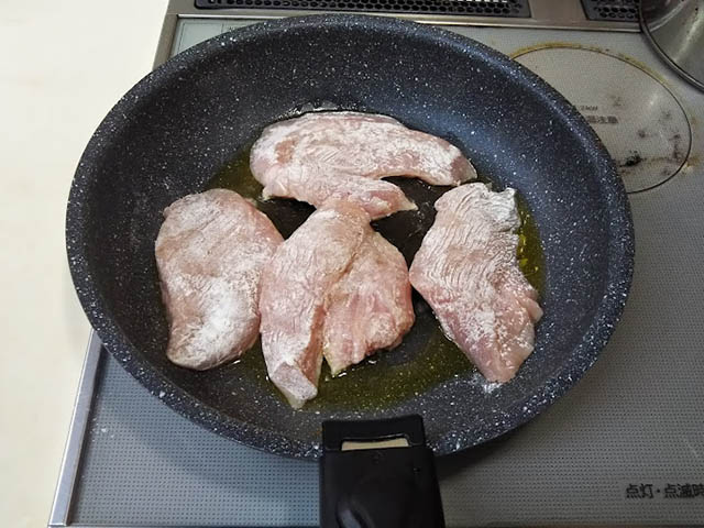 スカロッピーネは豚ロースを使うレシピと鶏むね肉を使うレシピがあって、豚の時はソースにきのこを加えますが、鶏のレシピはレモンバターソースだけのケースが圧倒的に多いのです。しかし、たまたま家にしめじがたくさんあったので、今回はきのこを加えたレモンバターソースを作ります。