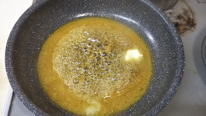 8.オレンジジュースが↑くらいになったら肉を取り除け、汁にバター、砂糖、レモン汁を加え、とろみがつくまで煮詰める