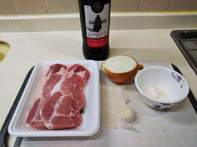 4. 水とシェリー酒を入れて塩胡椒で味をつけ、豚肉を再び入れて少し煮る