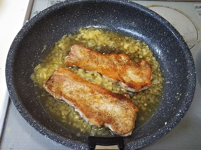 5. 2分位温めたら肉を皿に盛りつけ、ソースはとろみがつくまで煮詰める