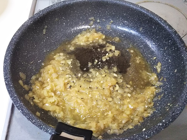 3. 玉葱とニンニクはみじん切りにして肉を焼いたフライパンできつね色になるまで炒める。