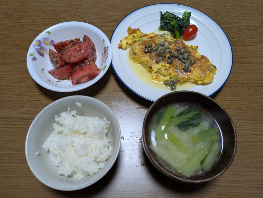 トマトとアールグレイのサラダ、ごはん、味噌汁を合わせた献立例