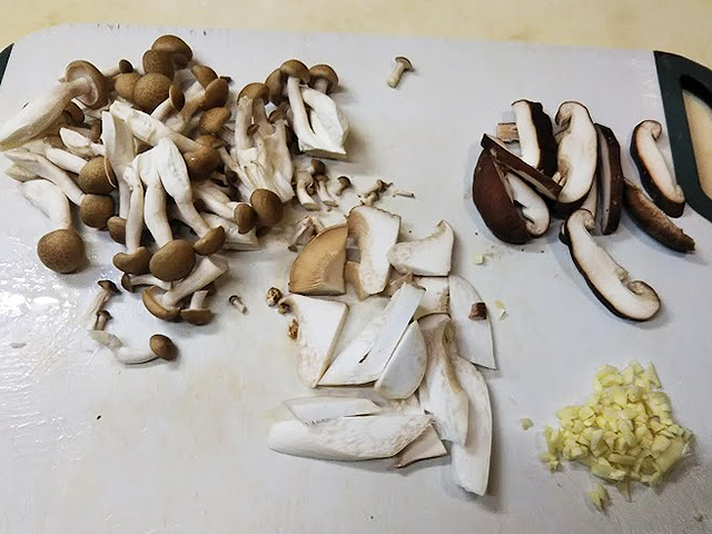 4. 焼いてる間に材料を切る。椎茸とエリンギは薄切り、しめじは石づきを落としてバラバラにほぐす。ニンニクは微塵切りにしておく