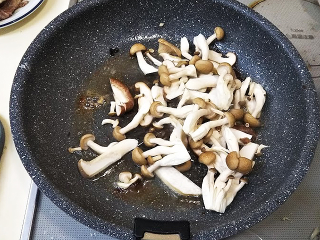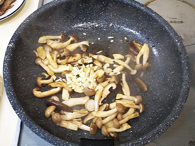 8. きのこがしんなりしてきたらニンニクを入れて更に炒める