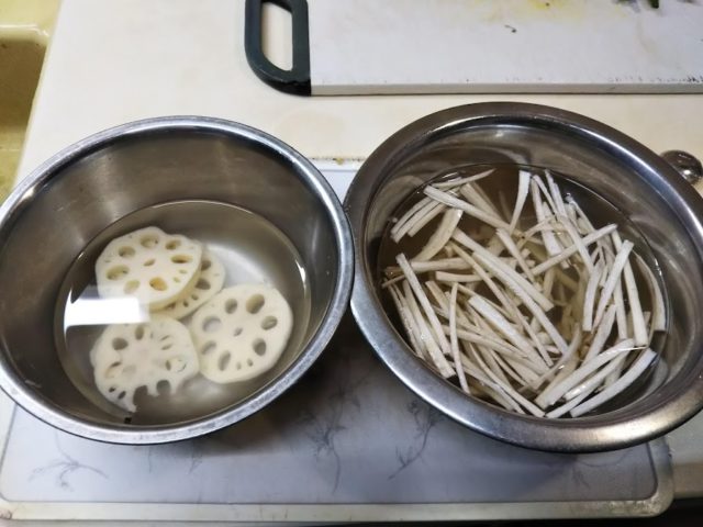 1. 牛蒡は皮を剝き千切りにして酢水につけておく。蓮根は皮を剝き4枚輪切りにして酢水に漬けておく