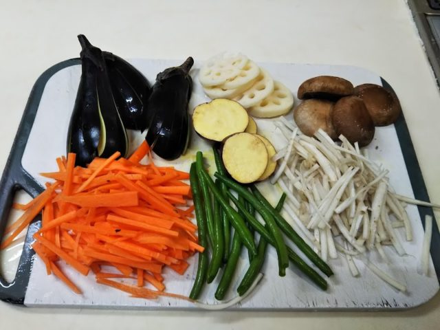 5. さつま芋の後、茄子、蓮根と椎茸、隠元・人参・牛蒡の順に挙げていく