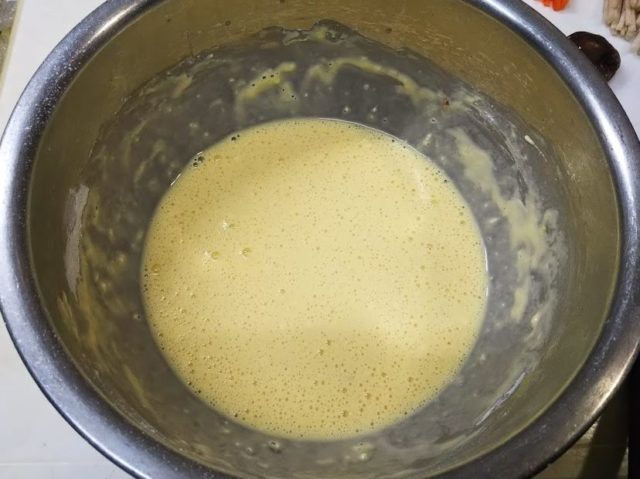 3. ボウルに卵を割り入れ、水で加えて混ぜ合わせる。小麦粉を少しずつ加えて混ぜ、ちょうどいい濃度にする