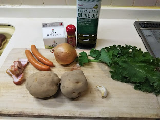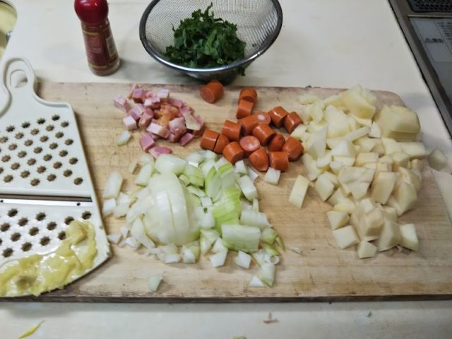 1. じゃが芋、玉葱、ベーコン、ソーセージはそれぞれ1㎝角に切る。ニンニクはすりおろしておく