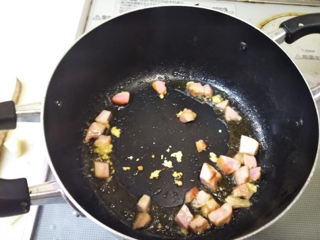 4. 同じフライパンでベーコンとおろしたニンニクを炒める
