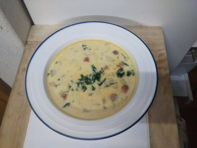 ズッパ・トスカーナ、名前から言ってイタリア料理だと思っていました。具沢山のスープもいかにもイタリア的ですし。ズッパ自体は確かにイタリア料理なのですが、これはアメリカ人が考えた米製イタリアンのようです。日本人もマカロニグラタン、ドリア、ナポリタンなど和製イタリアンをいろいろ創り出しているので、アメリカにもそういった動きがあってもおかしくはないですね。オリーブガーデンというアメリカにあるイタリア料理のチェーン店が考案して広めたみたいです。