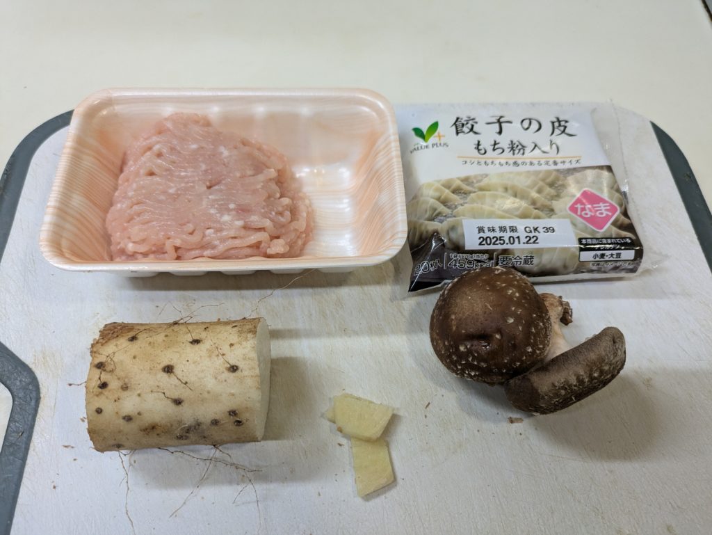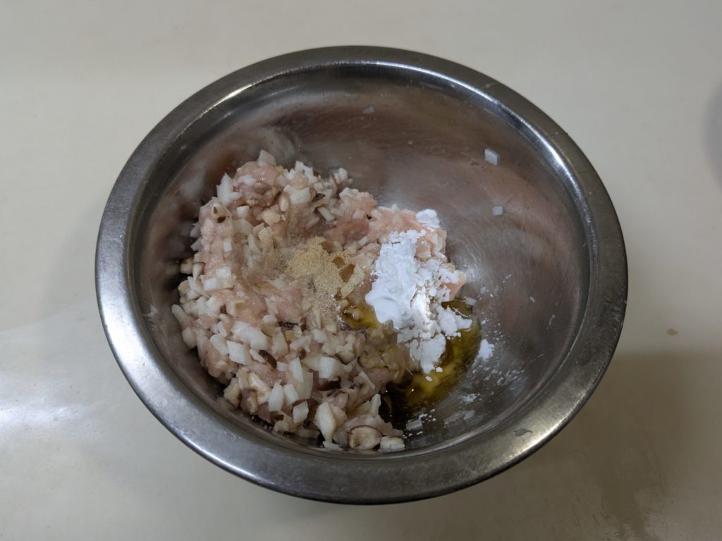 中国の料理本から鮮准山冬茄鶏肉餃(Chicen Dumpling with Fresh Chinese Yam and Black Mashroom)という料理です。鮮准山(Chinese Yam)は山芋、冬茄(Black Mushroom)は椎茸です。本家本元は山芋と干し椎茸で作るのですが、私は生椎茸と長芋で作りました。