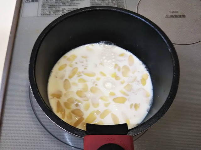 2. 小鍋に牛乳とアーモンドを入れて加熱し、牛乳にアーモンドの香りをつける
