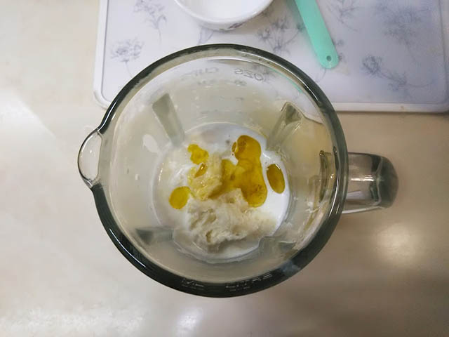 3. 1.のフランスパンは水気を絞ってミキサーに入れる。その他すべての材料をミキサーに入れて攪拌する。