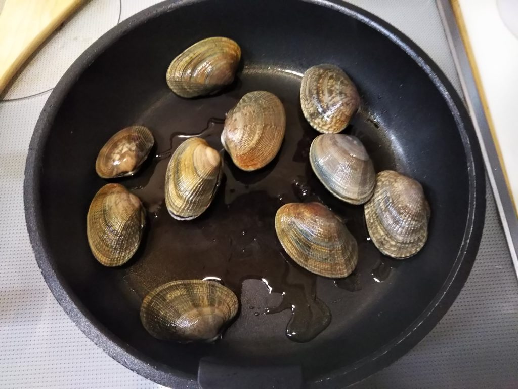 5. 別の鍋かフライパンに油を敷いて温め、熱くなったらアサリを入れて軽く転がす