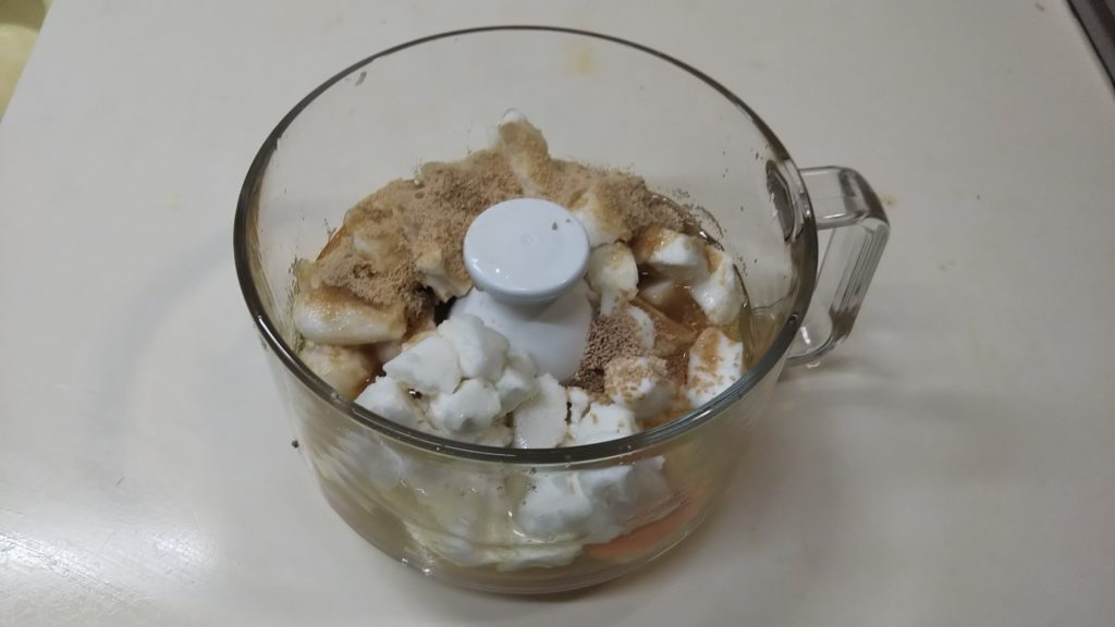 1. オーブンを180℃に予熱しておく。フードプロセッサーに卵を割り入れ、はんぺんはちげって入れる。すべての材料を加えて攪拌する